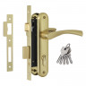 Комплект состоит из: ручек на планке (2 шт.), корпуса замка (1 шт.), цилиндрового механизма (1 шт), ключей (5 шт), ответной планки (1 шт.). Также в комплекте идёт крепеж для установки корпуса, ручек на планке и цилиндра.